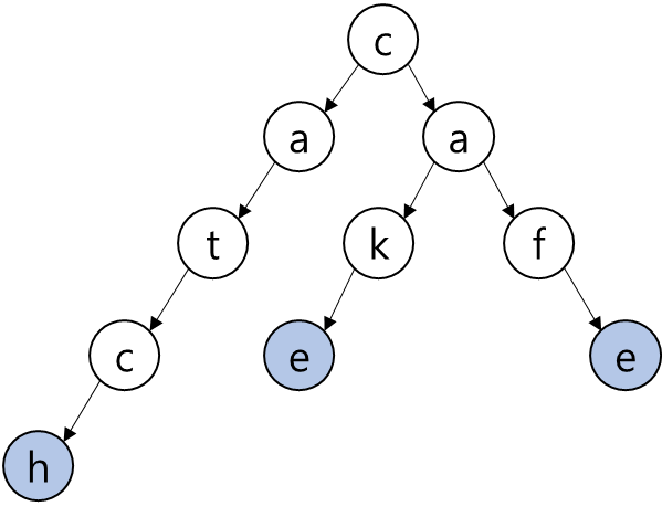 다음 구조는 "catch", "cake", "cafe" 3개의 단어를 저장하고 있는 Trie 트리이다.